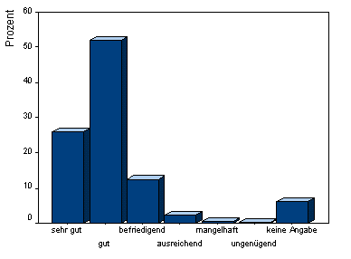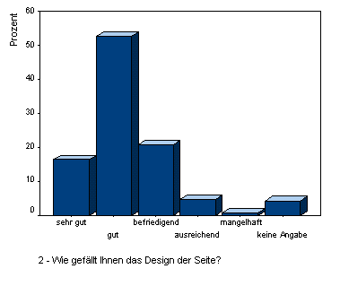44 % der Befragten bewerten die Übersichtlichkeit mit "gut", knapp 16 % mit "sehr gut". Nur 2 % der Befragten geben der Übersichtlichkeit die Note 5 oder 6. Ein überaus gute Bewertung erhält auch die Themenvielfalt der Website. 75 % der Befragten sprechen der Themenvielfalt ein "gute" bis "sehr gute" Note aus. Nur 0,6 % sehen die Themenvielfalt als nicht ausreichend an.