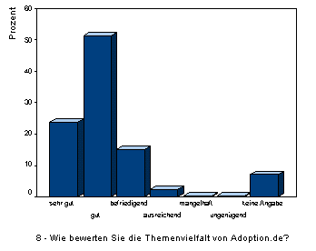 Auf die Frage: "Wie bewerten Sie den inhaltlichen Aufbau der Seite adoption.de?", äußerten sich knapp 78 % mit "gut" und "sehr gut". Unter 10 % bewerteten die Seite mit "ausreichend" oder schlechter.